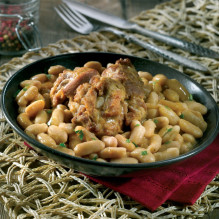 La viande de jarret désossée a cuit lentement avec les haricots lingots dans une onctueuse sauce cuisinée à base de tomate, d'ail et de persil... Un vrai plaisir pour les papilles !